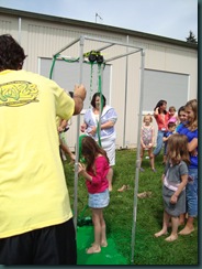 The girls went to Vacation Bible School this week. They had a lot of fun. Today they sang songs for parents and then we had pizza. They also had the Ultimate Slooze Show (similar to Double Dare but with a religious message slipped in). At the end Kaitlyn got slimed!